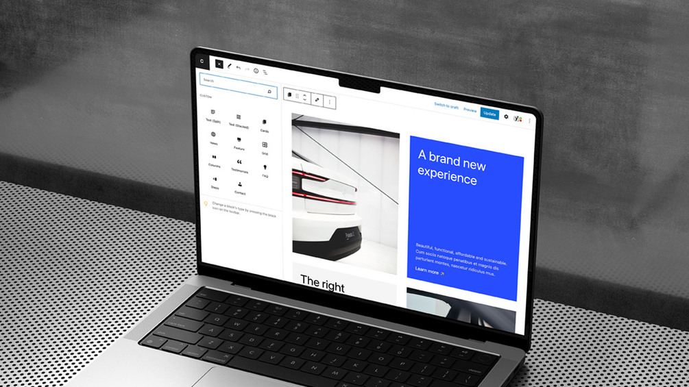 Blocks included: Text, Text alt, Hero, Cards, News, Feature, Columns, Testimonials, FAQ, Steps, Forms and more.